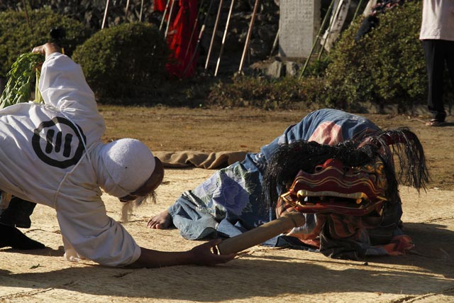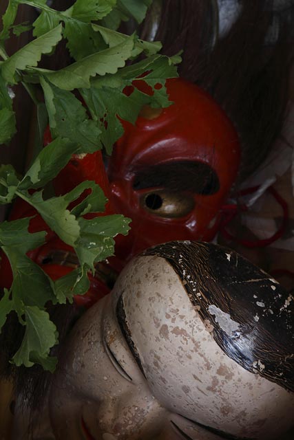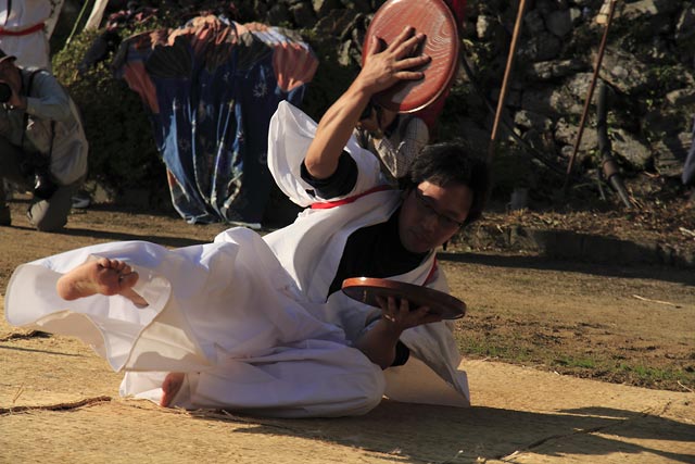 徳島県三好市西祖谷山村と高知県大豊町の県境の山里に有瀬。 「かぐら踊り」は有瀬三部神社祭礼で奉納。午前10時半頃から「おなばれ」。神社から石段を下った御旅所の有瀬小学校(休校中)で午後3時頃から「かぐら踊り」。各演目に「芋植え爺さ ん」の狂言役が。婿、嫁、お下女、おばあさんの仮面集団も登場。 徳島県指定無形民俗文化財。※2013年8月1日撮影