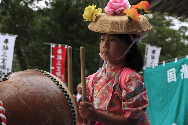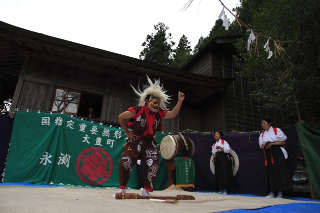 吉野川を眼下に見下ろす山の中腹に「永渕神社」は有る。 永渕神楽はその昔、戦乱に敗れた者が京都から讃岐・阿波を経てこの地に入り伝えたとの説がある。町には同種同系のものとし て「岩原神楽」があり「岩原・永渕神楽」と称される。鳴り物は大太鼓と鉦拍子だけとシンプル。 国指定重要無形民俗文化財。※2013年10月22日撮影