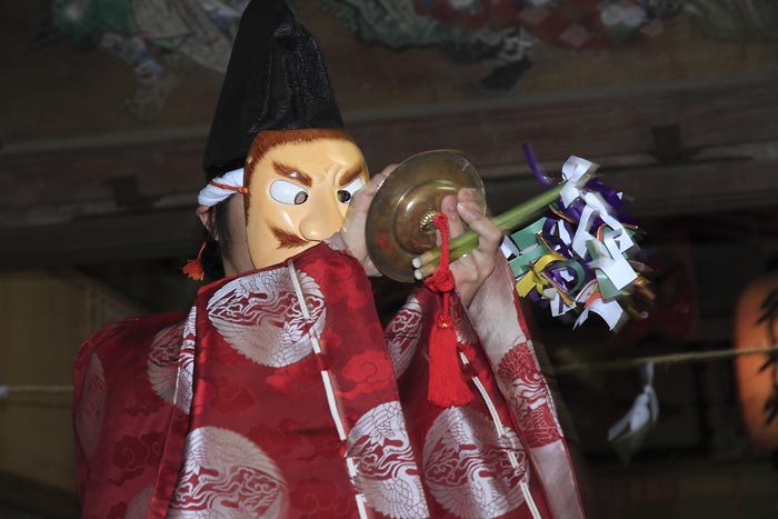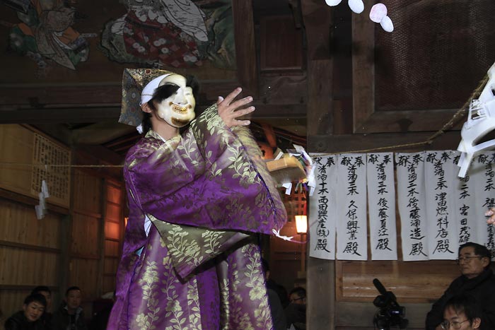 大洲市と近辺の各神社において、年間約40回余り舞われる「藤縄神楽」。 大洲市八多喜の肱川沿いに祇園神社。午後1時から5時過ぎまで奉納。肱川の堤防に駐車スペースがある。 愛媛県指定無形民族文化財。※2014年02月03日撮影