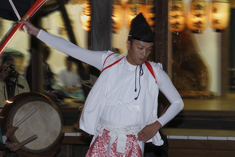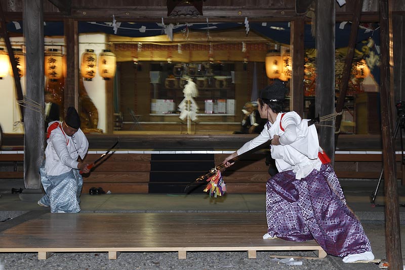 徳島県東みよし町中庄、八幡神社で執り行われた「金丸八幡神社宵宮神事」。 かがり火に照らされた境内での神楽の舞。神事は「おんじゃくの行事」から始まります。紐を 操りながら前後に揺り動かし、神殿に飛び込ませて納めます。降神の儀式、上手く飛び込むと、 見物客から拍手喝采。神楽の舞の奉納で、気象の安定を願い五穀豊穣を祈願するそうです。 ※徳島県無形民俗文化財。2015年10月14日撮影。