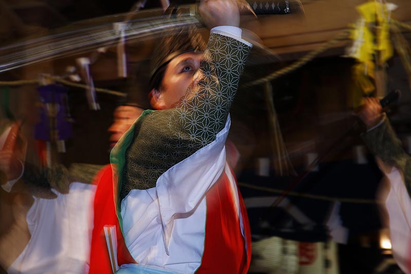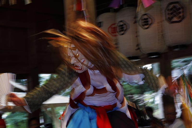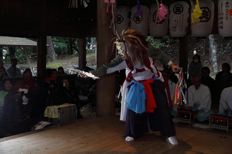 四国カルストの麓、山深い処に梼原町。梼原川にかかる屋根付き「御幸橋」を渡ると三嶋神社。 約一千年の歴史を伝承されていると言われている。急テンポな鳴り物とダイナミックな舞が特等的だ。 国指定重要無形民俗文化財。※2015年10月30日撮影