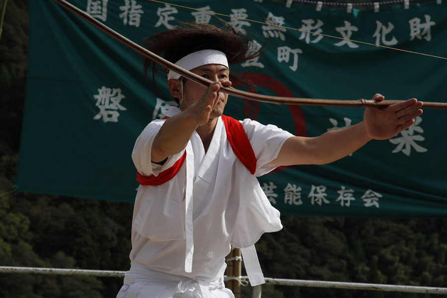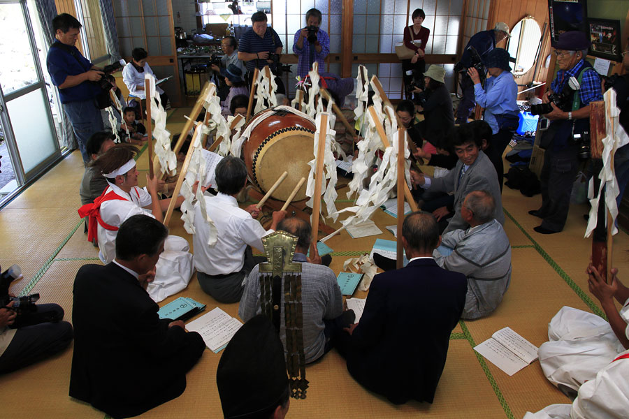 徳島県との県境の山深い急斜面に岩原地区。眼下はるか下に吉野川が。 皿鉢料理を囲んだ「酒宴」が終わると、大太鼓を取り囲み幣木(散華-さんげ)を振りながら呪文を唱える。 散華の神事は他地域の土佐の神楽には無く珍しい。道化役の爺面が場を盛り上げる。谷の向こうは永渕神楽が奉納される永渕地区。土佐の神楽では「岩原・永渕神楽」と分類されています。 ※2016年10月15日撮影