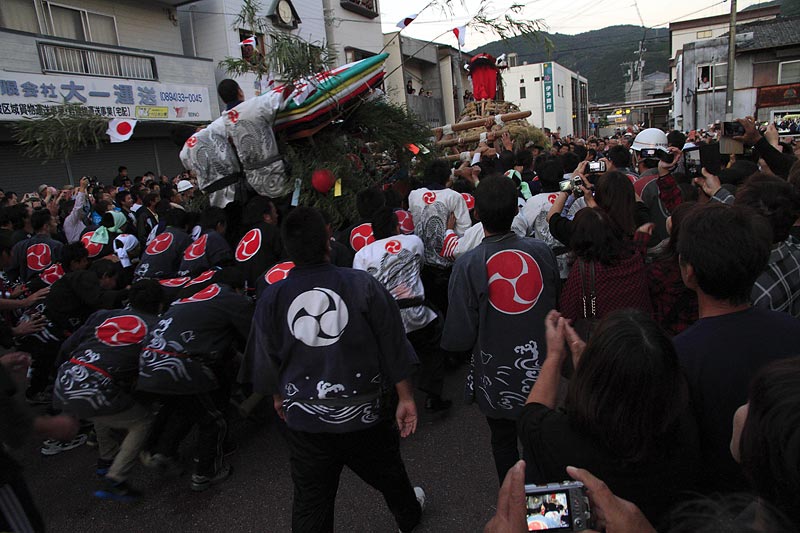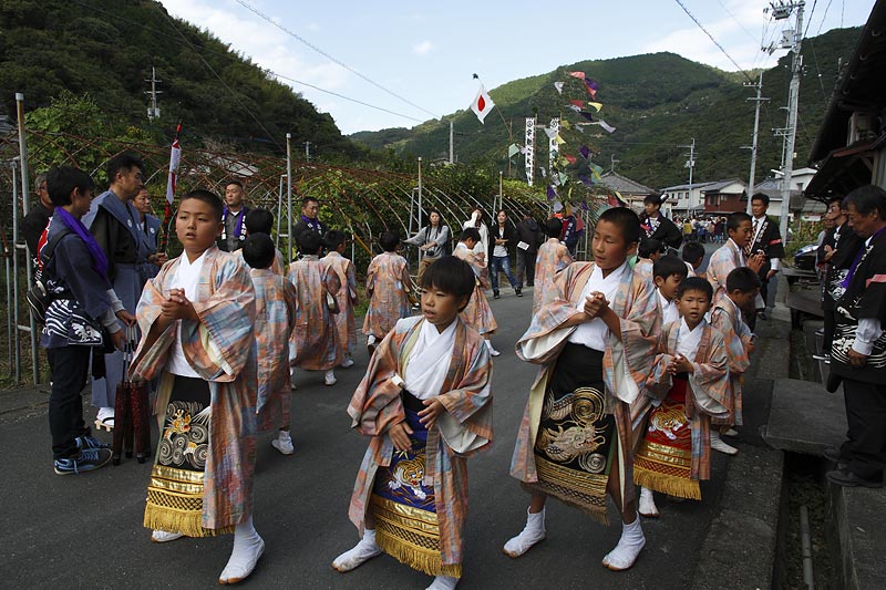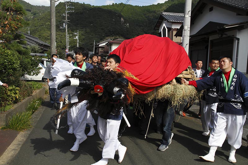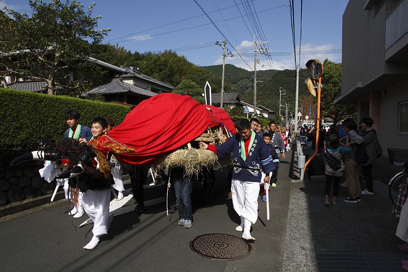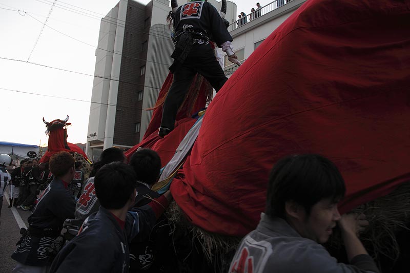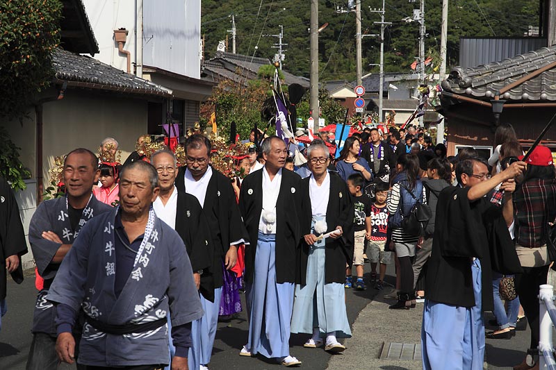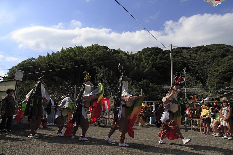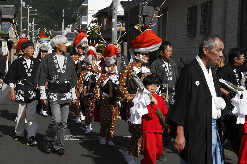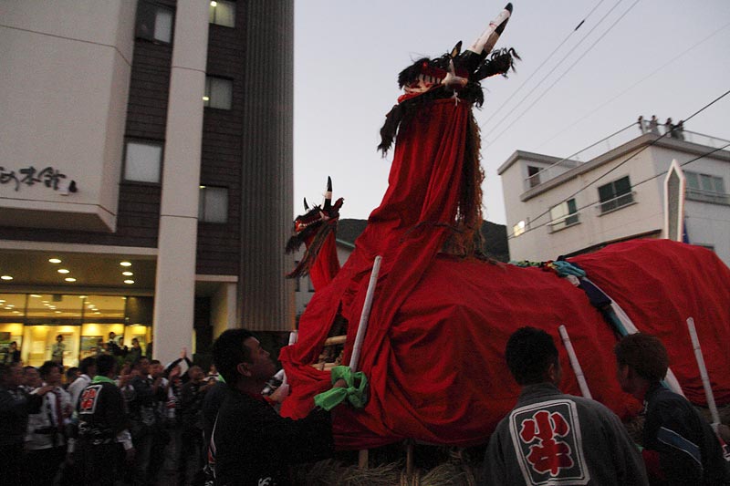 愛媛県南予地方、西予市三瓶町の「三瓶秋祭り」を撮影。 「牛鬼」を先頭に稚児、子ども甚句、五つ鹿、神輿等々、最後尾の「四つ太鼓」まで200mはあろうか、延々と続く「練り」。 見どころは夕刻からの「牛鬼」と「四つ太鼓」の鉢合わせ。