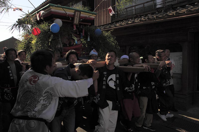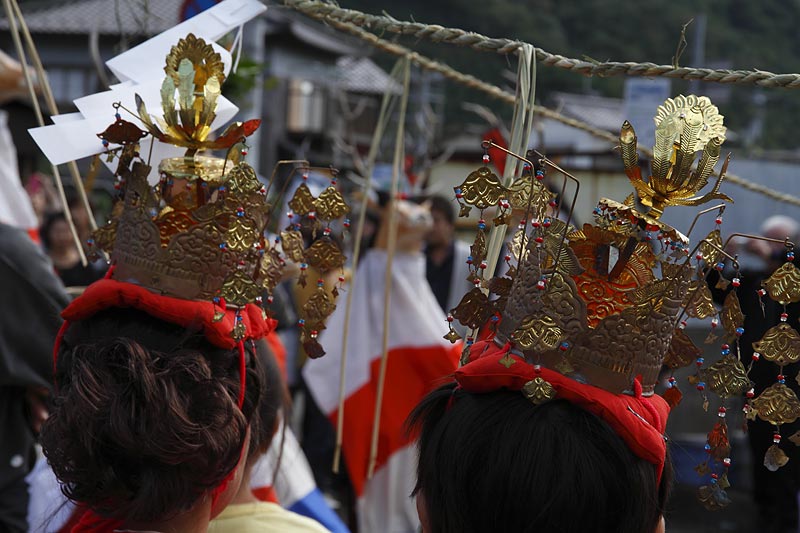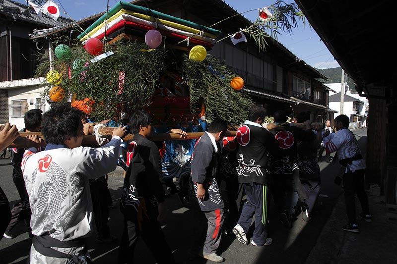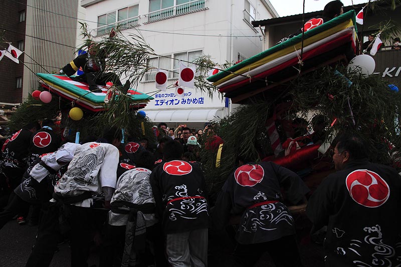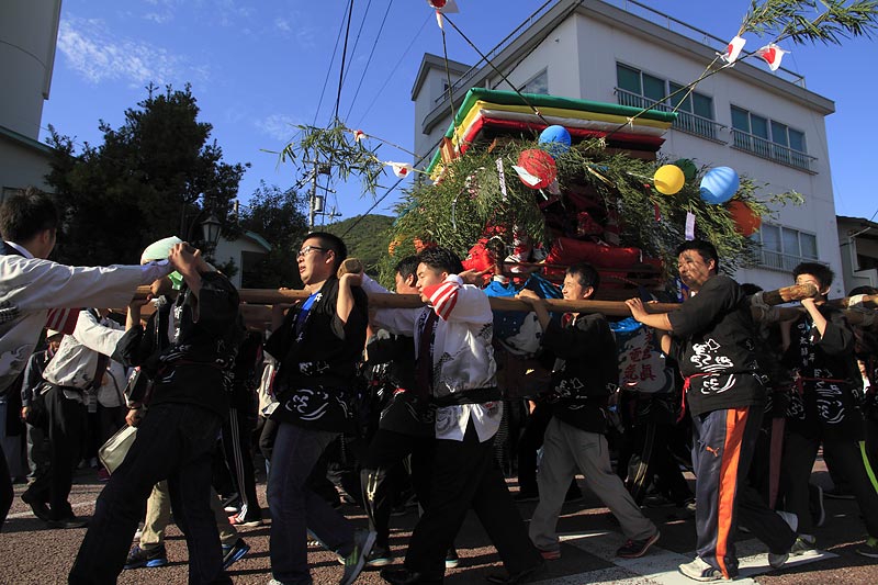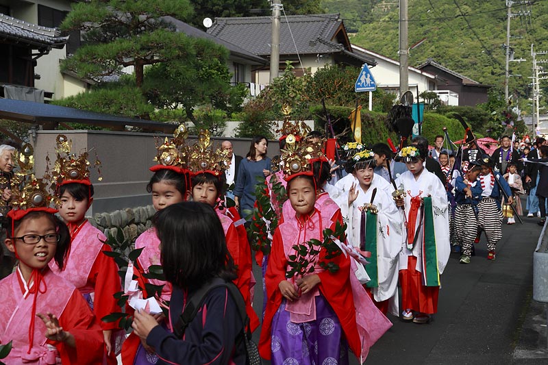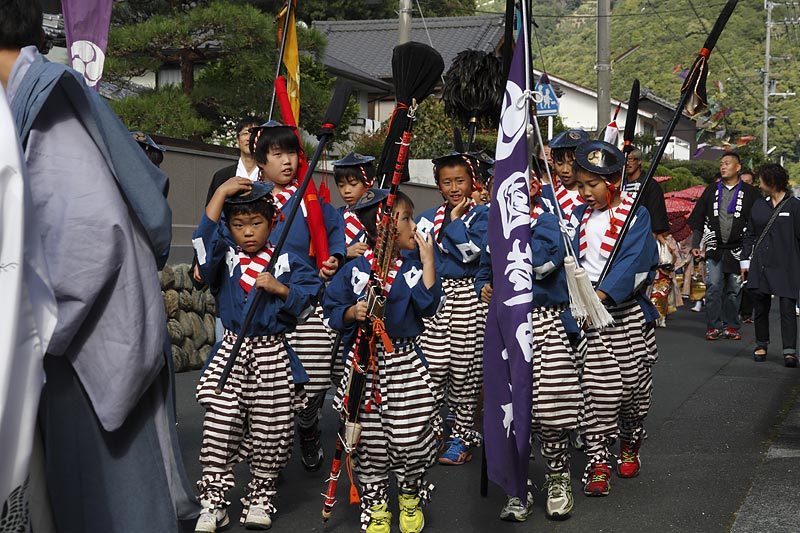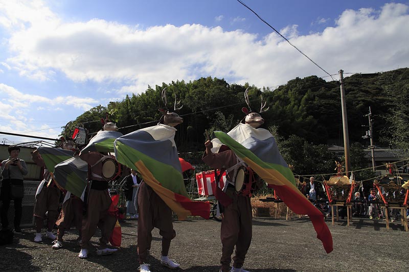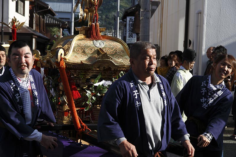 愛媛県南予地方、西予市三瓶町の「三瓶秋祭り」を撮影。 「牛鬼」を先頭に稚児、子ども甚句、五つ鹿、神輿等々、最後尾の「四つ太鼓」まで200mはあろうか、延々と続く「練り」。 見どころは夕刻からの「牛鬼」と「四つ太鼓」の鉢合わせ。